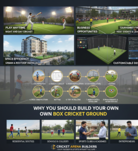 Whether for recreational play, coaching, school activities, or commercial purposes, a professionally built box cricket ground ensures that cricket enthusiasts can play anytime, anywhere, and in style. Turn your available space into a mini cricket arena that combines passion, performance, and profitability — and make your cricket dreams a reality today.